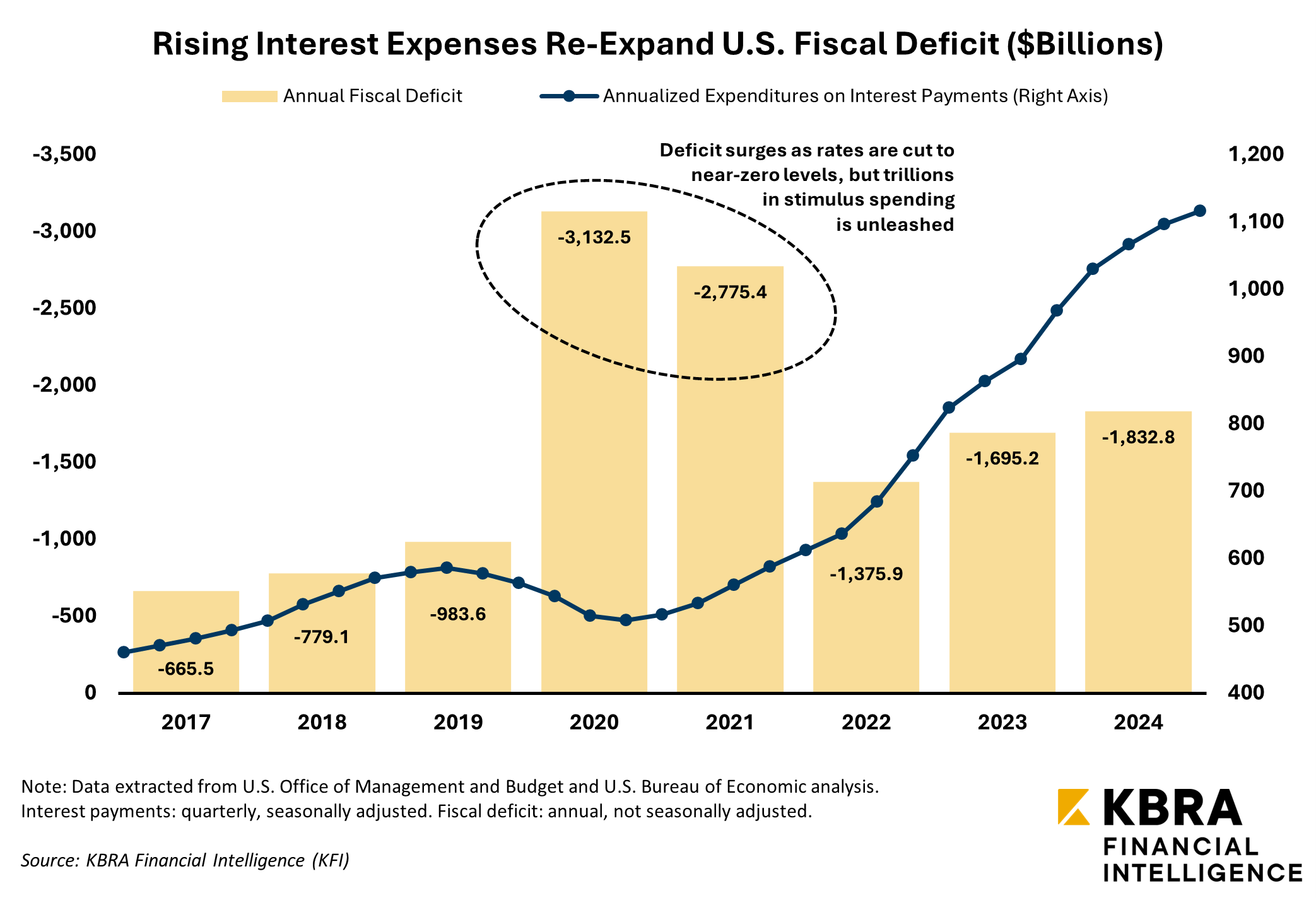 If the fed funds rate remains elevated longer than expected, it could sustain higher long-term rates across the yield curve, raising the interest costs tied to all new debt issued by the U.S. government. This is an increasingly significant concern, considering the U.S. fiscal 2024 deficit ballooned to more than $1.8 trillion, the third-largest annual deficit ever and up 8.1% YoY. The deficit is being supercharged by mounting interest payments that the federal government owes on its outstanding debt. Annual federal expenditures on interest payments recently surged to a record high north of $1.1 trillion, ramped up by aggressive monetary tightening between 2022-23. The expansion of the deficit signals that the U.S. is far outspending the revenue it is taking in, increasing the risk associated with holding its long-term Treasury bonds. In turn, that could be generating demand for higher yields to compensate U.S. creditors.