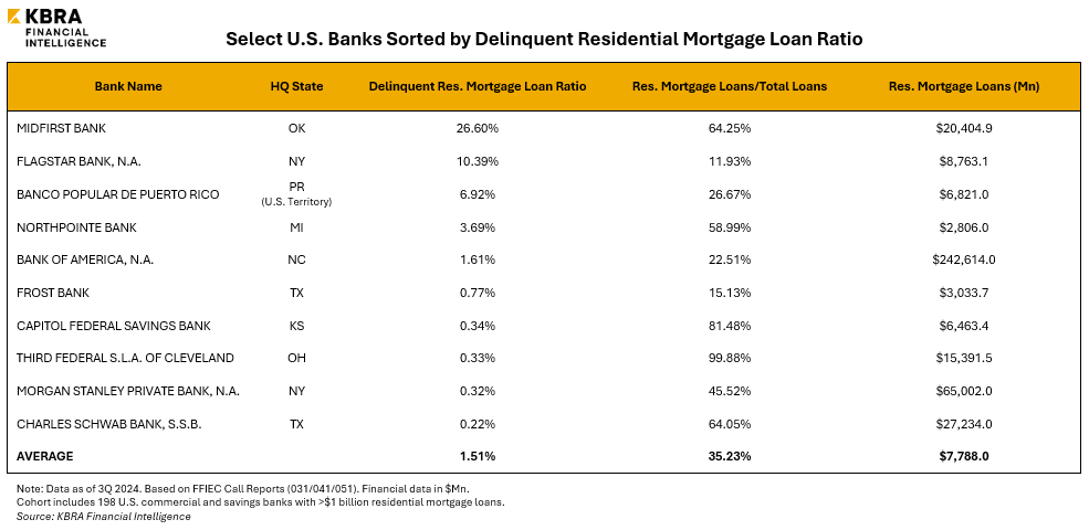 KFI last analyzed the state of the residential mortgage market in September, highlighting 2Q 2024 data. All U.S. banks (excluding those with foreign offices) were required to complete the filing their 3Q 2024 Call Reports by October 30. All quarterly data is now available to KFI clients via our web application and Excel add-in. Among nearly 4,400 reporting commercial and savings banks, the average rate of delinquency impacting residential mortgage loans was just 1.43%, up slightly from 1.39% in the previous quarter but still 23 bps below the five-year moving average. Among the 198 banks with more than $1 billion in mortgage loans, delinquency rates are only slightly higher at 1.51%.