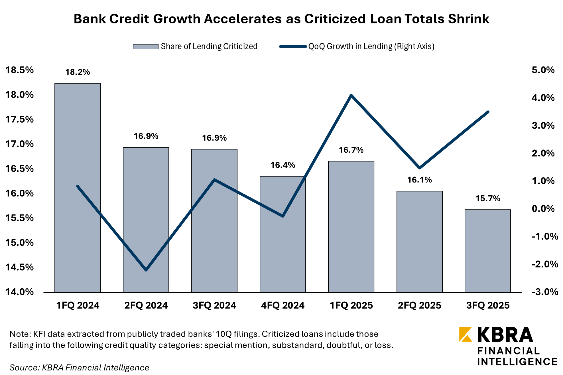 KFI’s analysis finds that the share of bank loans considered criticized—an aggregation of the special mention, substandard, doubtful, and loss categories—has been trending lower, falling to a two-year low of 15.7% in 3FQ 2025. While credit quality designations do not, in isolation, determine nonaccrual status or loss recognition, trends in criticized exposures can provide insight into emerging and realized credit stress within the portfolio. As of the latest data, it appears that such stress has generally abated in recent quarters, despite publicly traded U.S. banks accelerating their pace of loan growth.