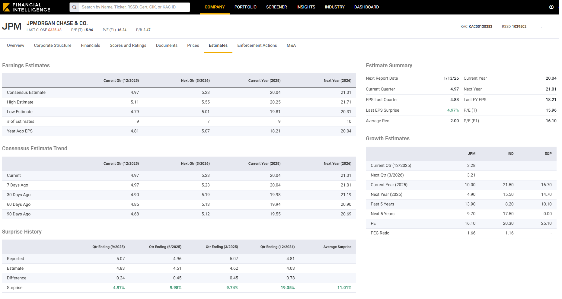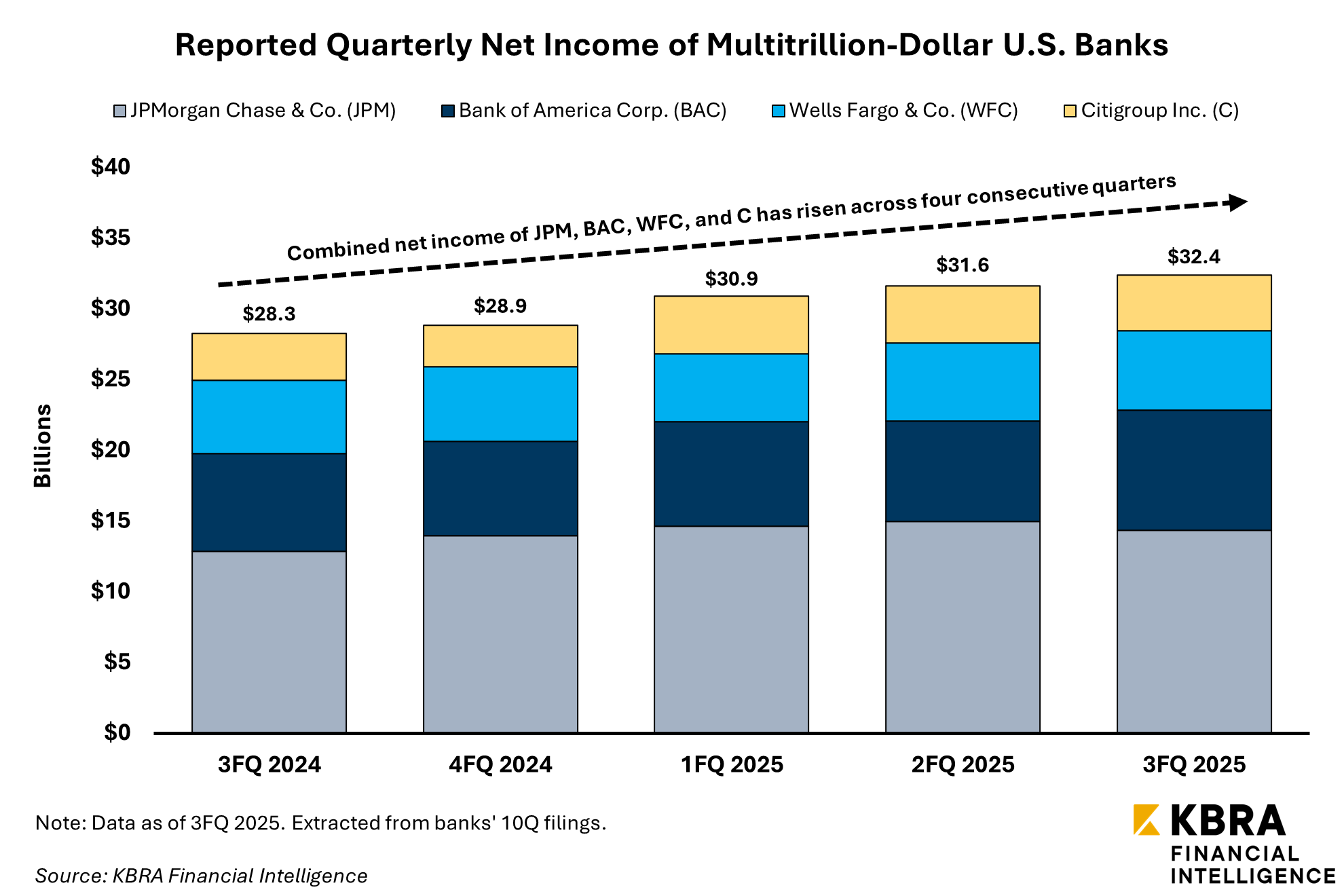 Four U.S. banks maintaining assets exceeding $2 trillion will report earnings throughout the same week. Combined net income figures of these institutions, including JPM, Bank of America Corp. (NYSE: BAC) (KFI Score: B), Wells Fargo & Co. (NYSE: WFC) (KFI Score: B), and Citigroup Inc. (NYSE: C) (KFI Score: B+), has risen across a period of four consecutive quarters to 3FQ 2025.