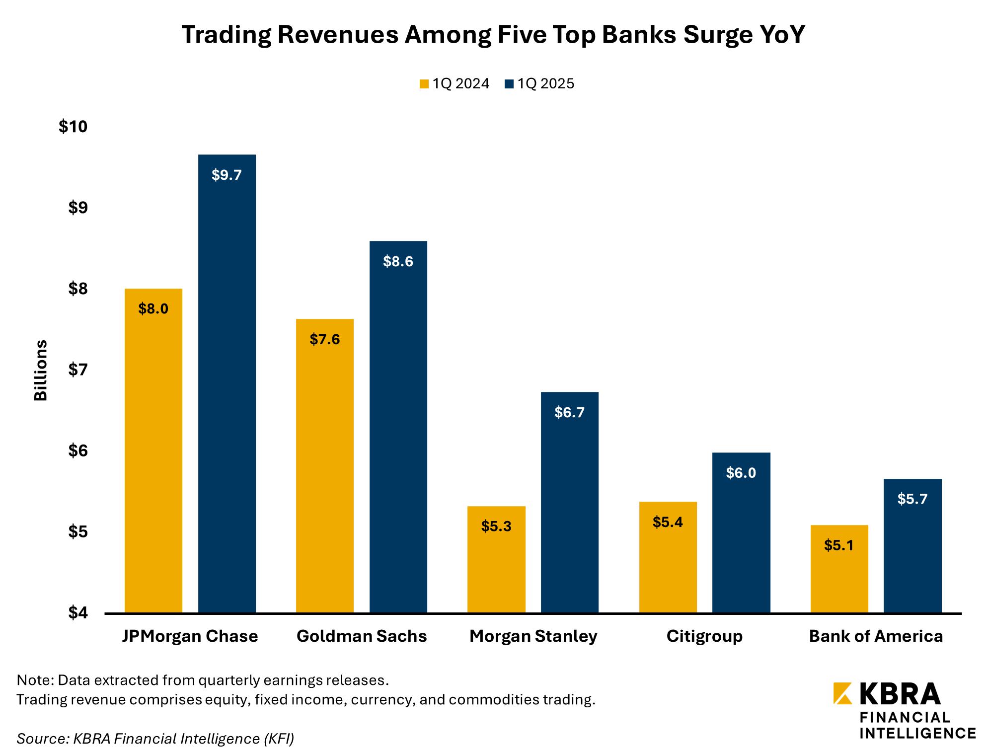 The emergent trading boom may further widen perpetuate an ongoing divergence in the headcount of bank holding companies (BHC) and their commercial banking subsidiaries. KFI recently highlighted a wave of ongoing job cuts that have reduced commercial banks’ headcount by more than 77,000 full-time employees since 2023. However, throughout that same period, the number of non-commercial bank employees among the U.S.’s BHCs has increased by almost 20,400. This suggests that BHCs have been determined to continue expanding their securities and investment banking divisions, even as material consolidation of the commercial bank workforce has taken place.