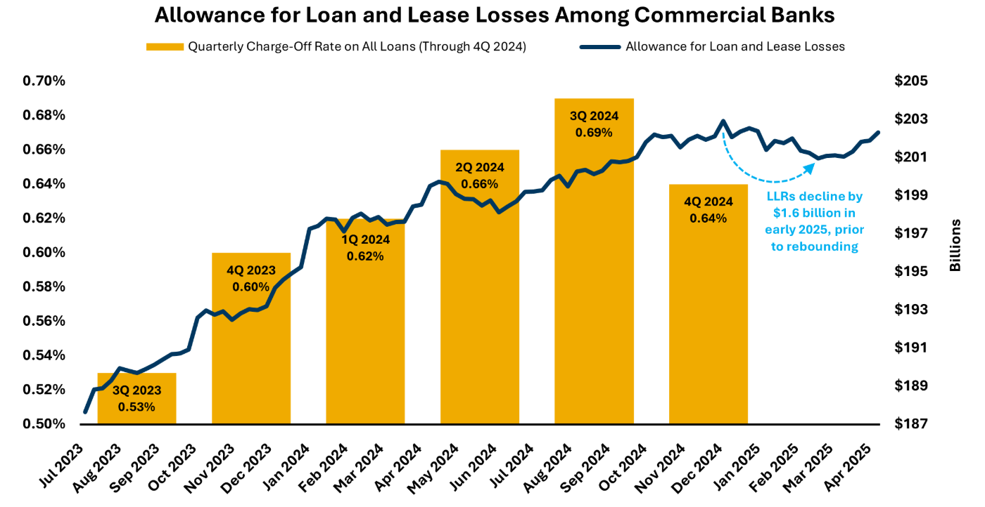 After reaching a nearly four-year high last December, LLRs had begun falling in the wake of a drop in charge-offs throughout 4Q 2024. The drop marked the first decline in U.S. banks’ charge-off rate in the past 11 quarters, signaling that a gradual buildup of bad loans had begun to ease. However, the drawdown in LLRs did not last, as banks began to reverse this trend in mid-February, preparing for the impact of impending tariffs on the economy. KFI has recently analyzed the potential negative implications of tariffs on construction and auto lending, which have been experiencing contraction on an annual basis.