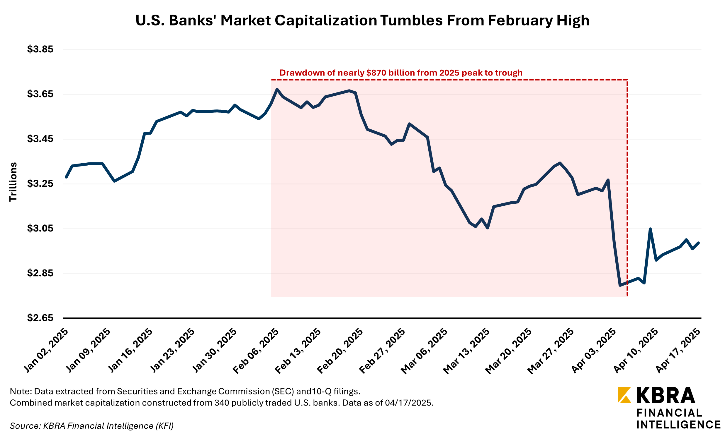 Shares of publicly traded U.S. banks have recently been hard hit by tariff uncertainties and a resulting U.S. growth scare. KFI data shows that the combined market capitalization of 340 publicly traded U.S. banks have declined by as much as $870 billion in 2025. The KBW Nasdaq Bank Index (BKX), which tracks the share prices of 24 publicly traded banks, is 22% below its February 18 peak, falling more steeply than the S&P 500’s 16% decline throughout the same period.