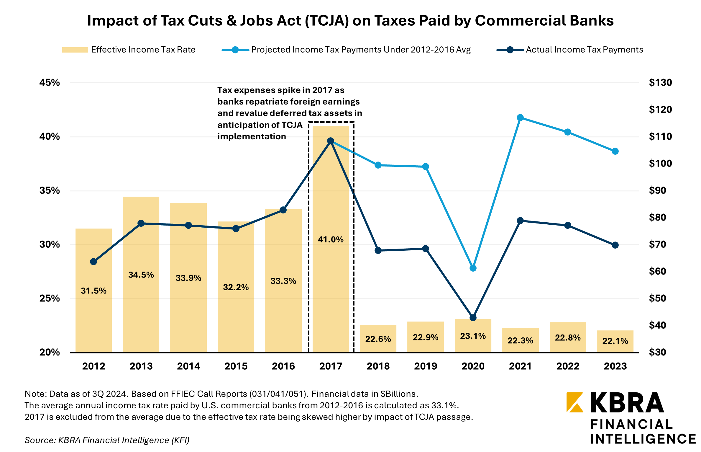 The TCJA’s implementation resulted in substantial tax savings for banks, with banks’ effective tax rate averaging 33.1% in the five years before 2017. If that rate had continued, banks would have collectively paid an additional $188 billion in taxes throughout the past six years, or approximately $31.3 billion more per year.