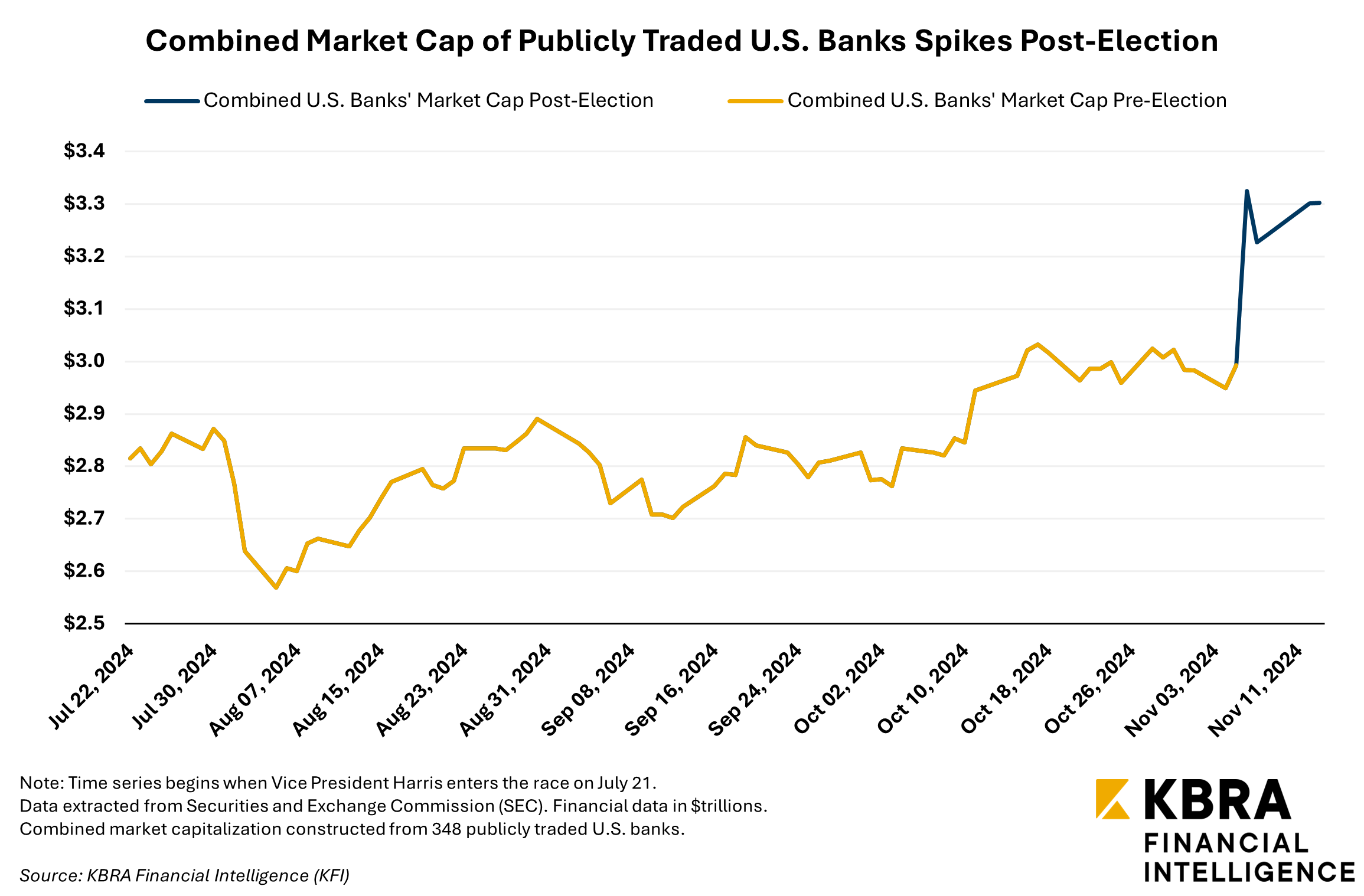 Shares of publicly traded banks rose following the election results on November 5, indicating that traders may be anticipating favorable legislative developments in the financial sector. Before the election, KFI highlighted how each candidate’s administration could influence new bank capital requirements, as well income from service fees and credit card interest rates. Tax policy, which can significantly impact banking income, is also likely to be a focal point during Trump’s term.