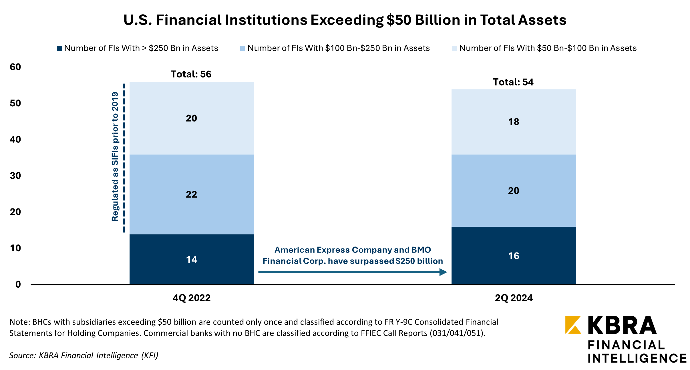 With the SIFI threshold raised to $250 billion, banks like SVB Financial Group (the parent of Silicon Valley Bank), Signature Bank, and First Republic Bank, which held assets between $110 billion and $213 billion by Q4 2022, were exempt from the stricter regulatory framework in place before 2019. By 4Q 2022, the final quarter before the 2023 bank failures, 56 U.S. financial institutions carried more than $50 billion in assets, but only 14 exceeded the elevated $250 billion SIFI threshold. As such, only the latter group faced the more stringent regulatory framework the entire group would have faced prior to 2019.