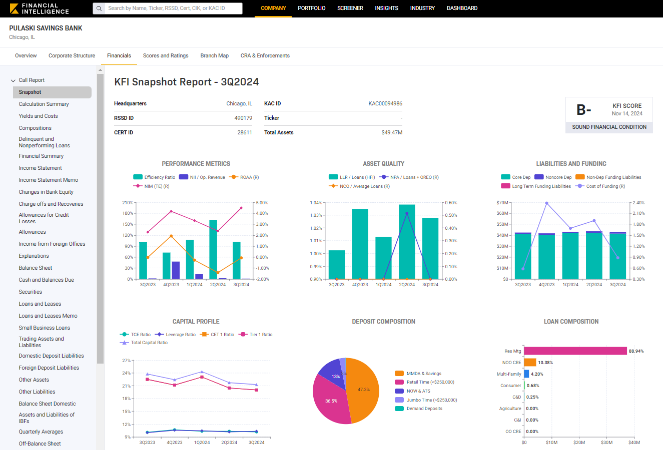 Nearly 90% of Pulaski’s lending was concentrated in 1-4 family residential loans, with the remainder largely being composed of commercial real estate. Individual banks and credit unions’ loan compositions can be viewed via KFI’s web app, as well as our Excel add-in’s Loan Category and Delinquency Report template.