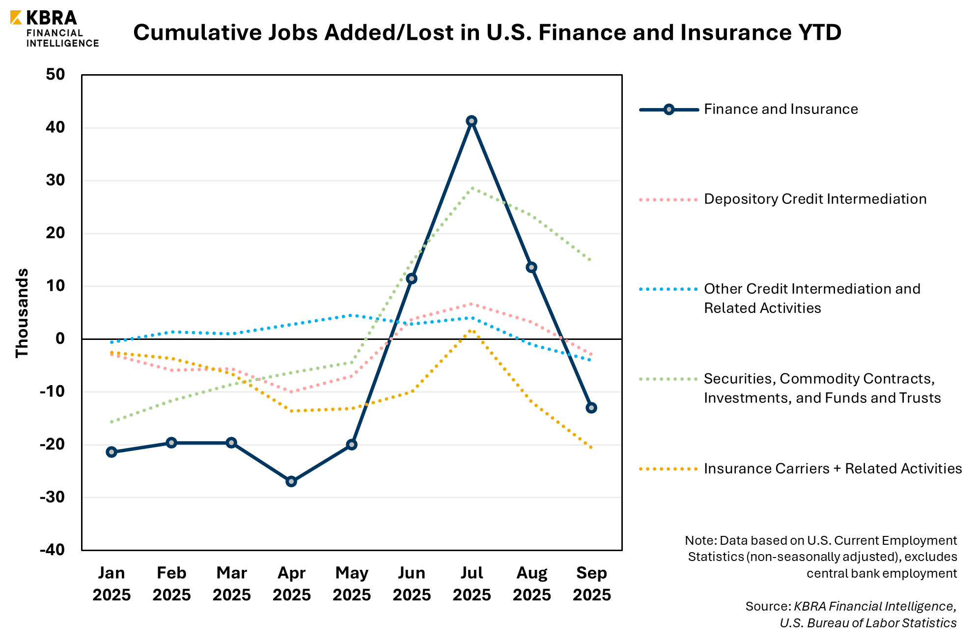The Bureau of Labor Statistics (BLS) report showed a net decline in finance and insurance payrolls in August and September’s non-seasonally adjusted figures, wiping out a year-to-date (YTD) gain that had accumulated in this category. Throughout the first nine months of 2025, the total count of U.S. finance and insurance jobs receded by 13,000. The depository credit intermediation subcategory—which includes banks, savings institutions, and credit unions—has contributed roughly 2,900 job cuts to the decline.