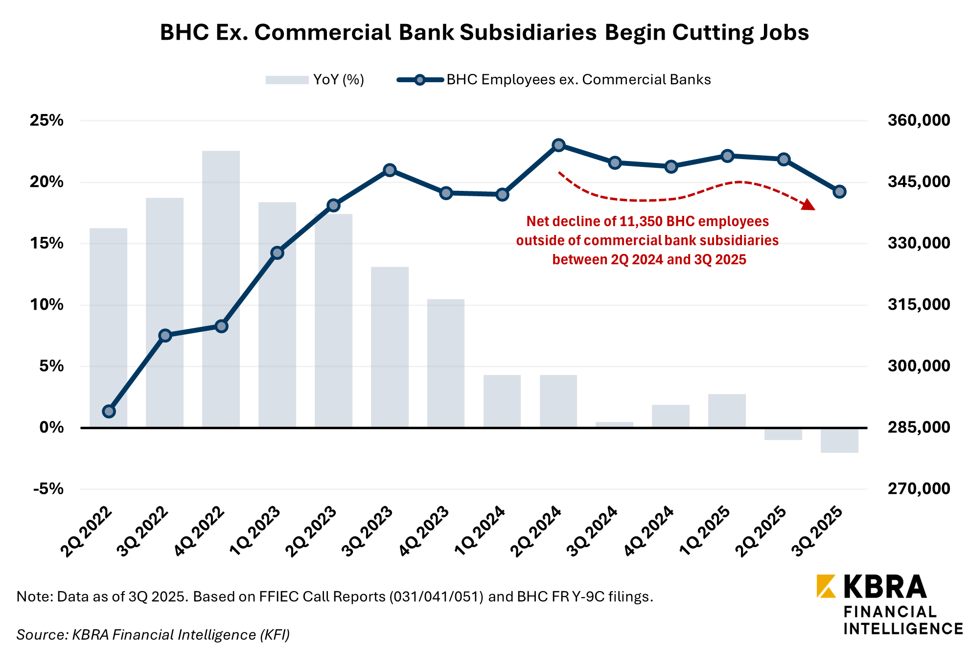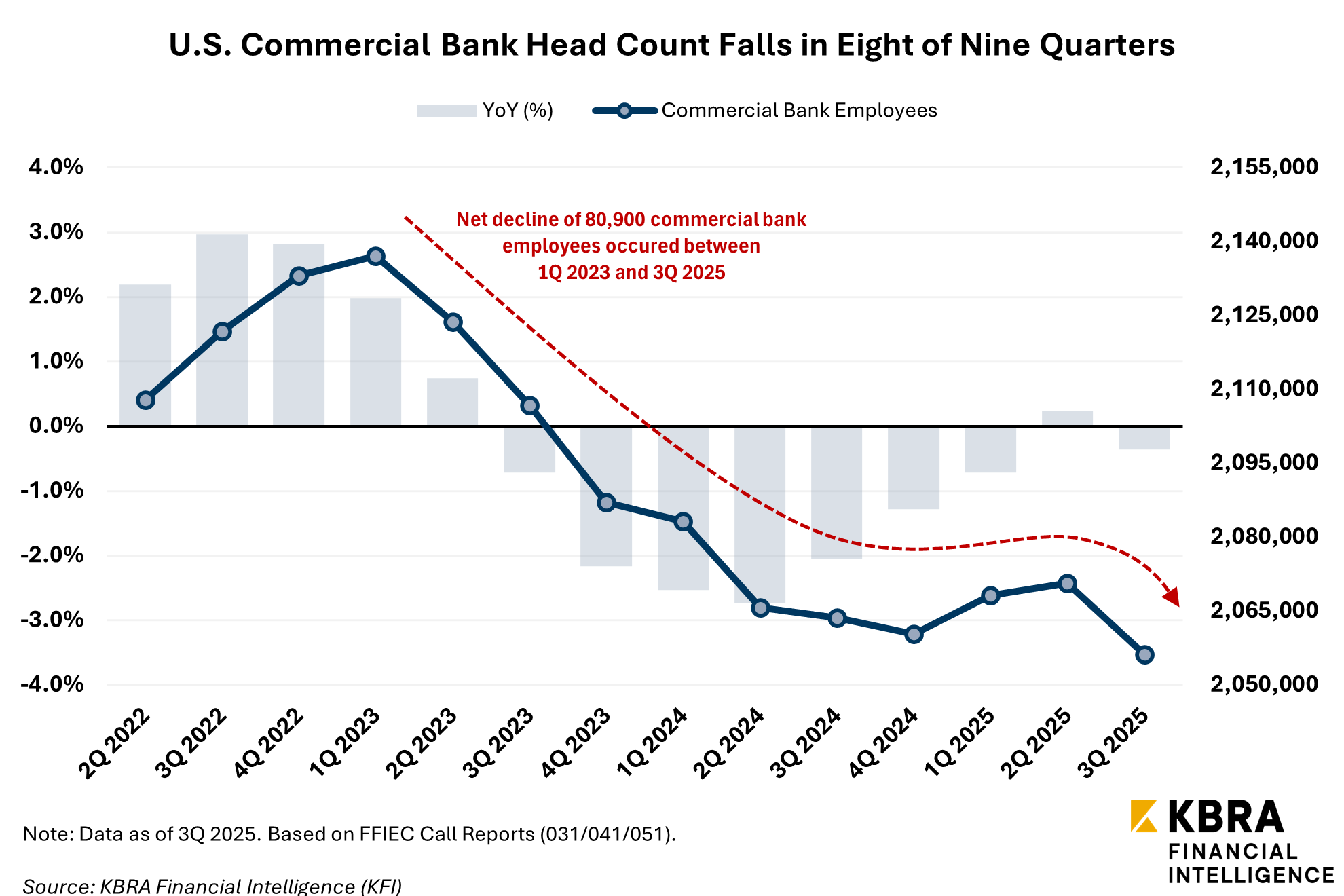 The latest Federal Financial Institutions Examination Council (FFIEC) call report data analyzed by KBRA Financial Intelligence (KFI) broadly aligns with the results of recent BLS surveys. Full-time employment across 4,432 U.S. commercial and savings banks fell by a net 7,460 positions year-over-year (YoY) in 3Q 2025. The drop aligns with the same trajectory observed in recent years, as banks have shed a cumulative 81,000 jobs since bank head count peaked in 1Q 2023.