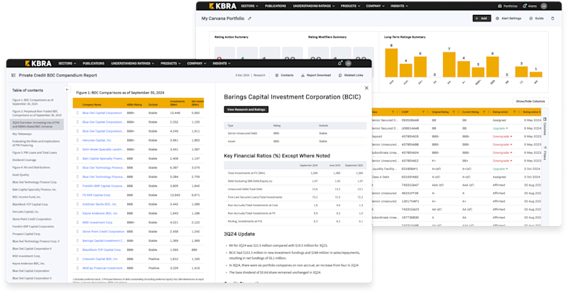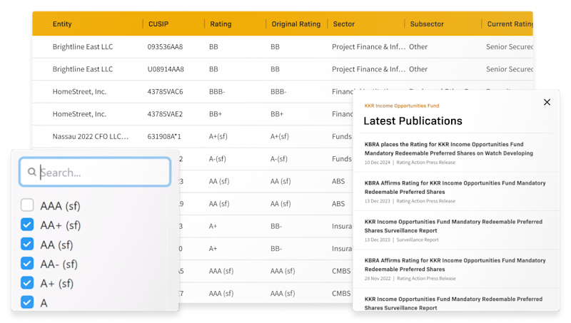 A centralized, intuitive dashboard for tracking KBRA credit ratings and analytics across your portfolio or sectors of coverage: