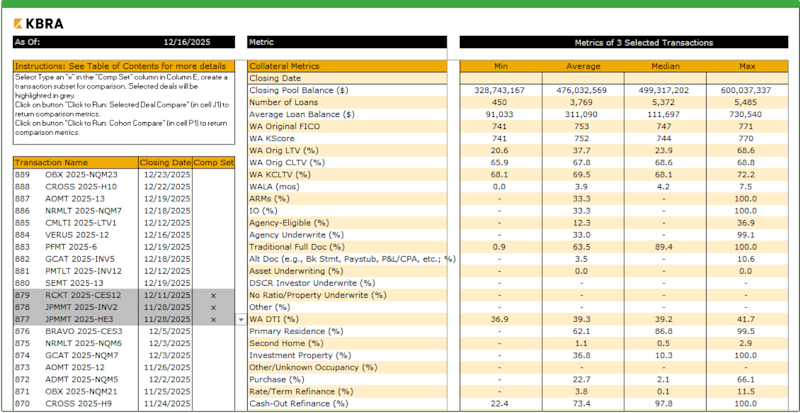 The tool produces comp tables using user selected deals to highlight key statistics across both KBRA-rated and non-KBRA transactions with deals dating back to 2010