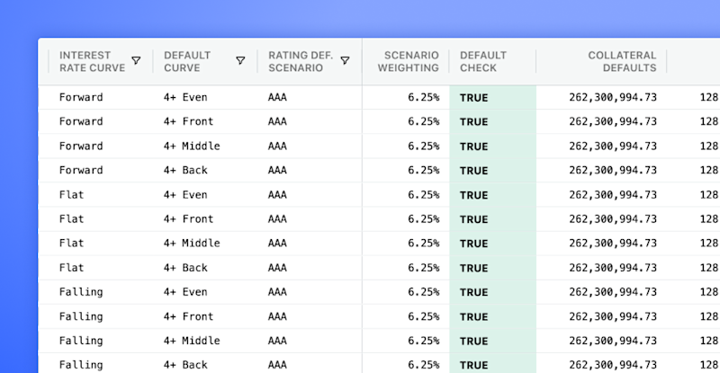 With the KBRA Portfolio Analysis Tool (K-PAT) integrated, you can explore scenario outcomes in detail. View cash flow results on-platform or export to Excel for collaboration and reporting.
